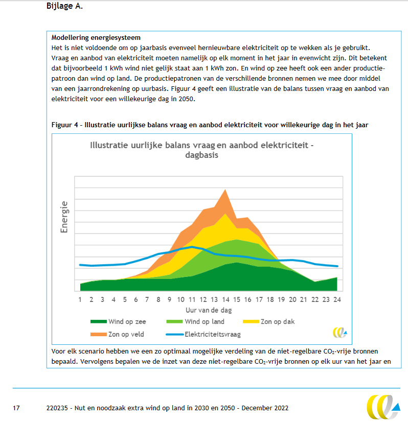 - ‘Met windmolens maken we de hele dag door energie, ook ’s nachts. We hebben dan meestal genoeg aan de kabels die al in de grond liggen. Dit scheelt geld.’ Dat is dus gewoon niet waar. Wel als je alleen per maand kijkt, maar niet als je per uur kijkt. Dan blijkt de meeste windenergie óók overdag geproduceerd te worden, terwijl de zon dan ook schijnt (ook met bewolkt weer doen die panelen het), zie deze grafiek ut het onderzoek door CE-Delft: